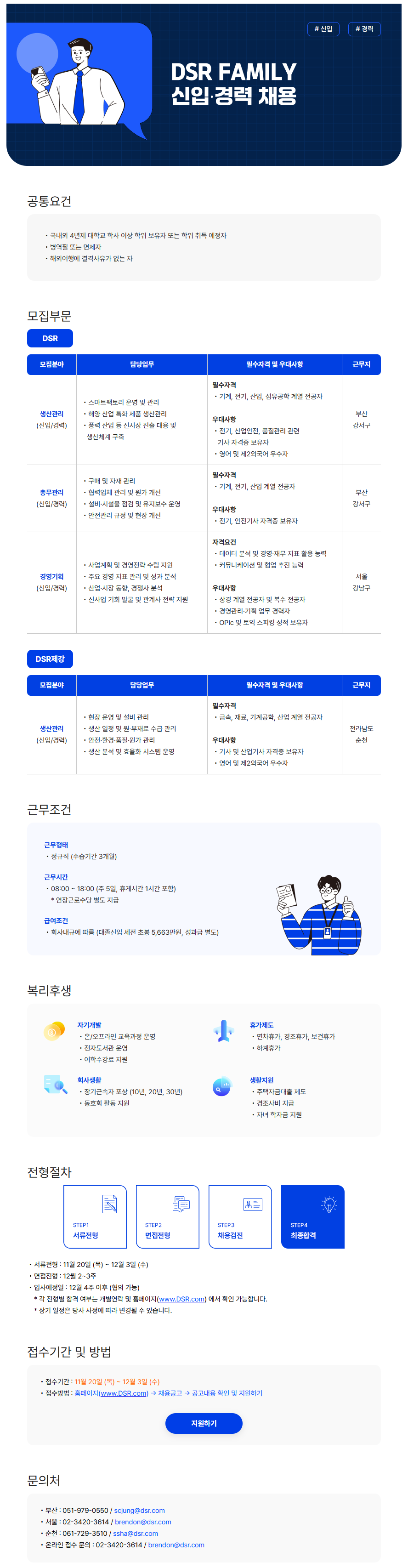 DSR이 미래를 함께 열어갈 인재를 모집합니다. 채용공고명 모집기간 DSR FAMILY 신입∙경력 채용 (생산관리, 총무관리, 경영기획) <1차면접 결과 발표> 2025.11.20 ~ 2025.12.03 채용마감